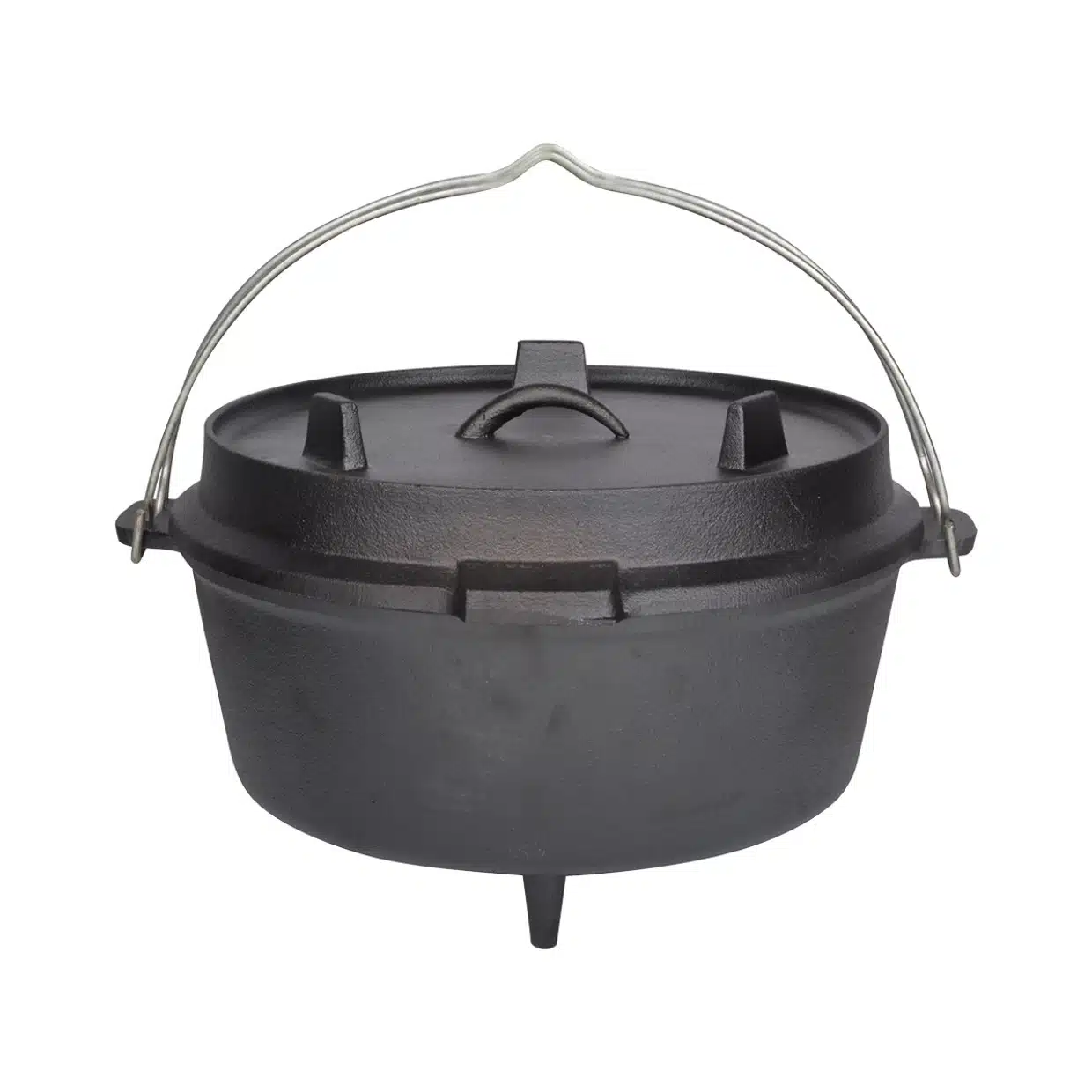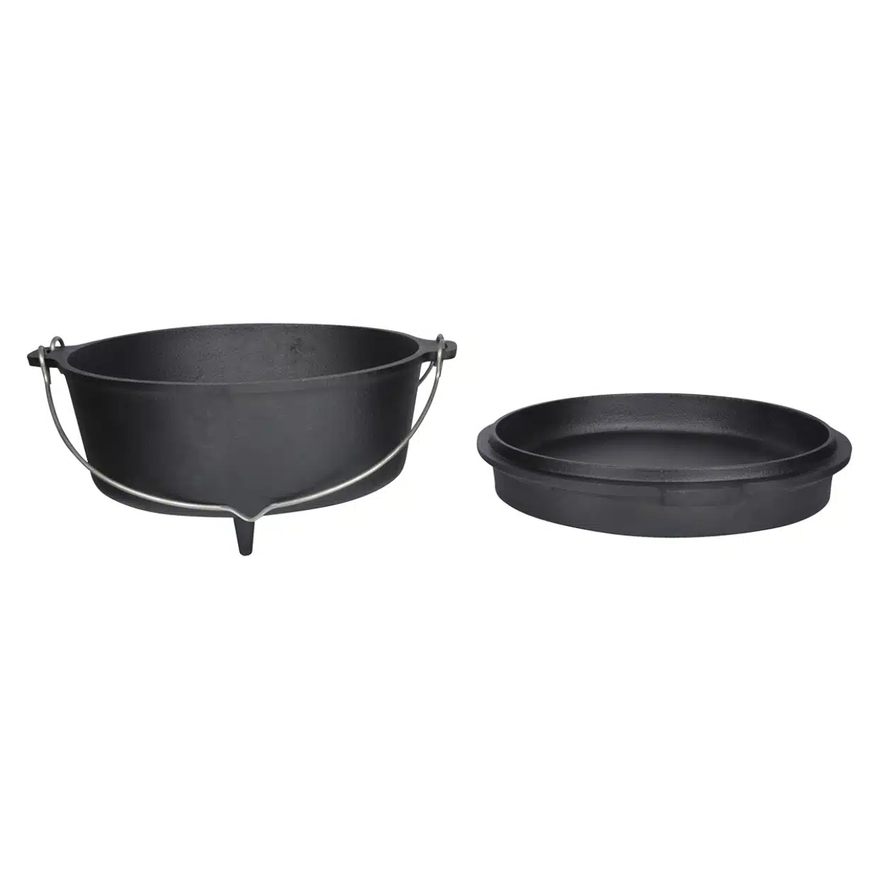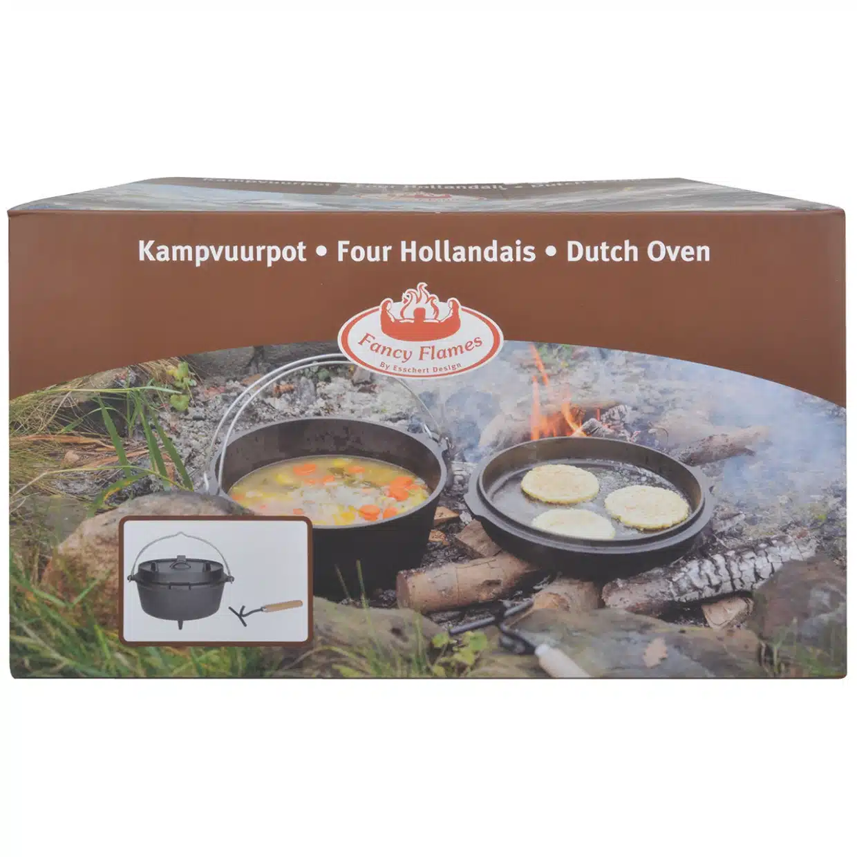 Een kampvuurpot is een traditionele dikwandige kookpot gemaakt van gietijzer, die al vele eeuwen gebruikt wordt. Dankzij het materiaal wordt de warmte gelijkmatig verdeeld over de kookpot en verwarmt het voedsel van alle kanten. Kolen of briketten kunnen eventueel op het deksel geplaatst worden om extra warmte van boven te creëren. Met zijn drie poten staat de kampvuurpot stevig in en op het vuur. Als alternatief kan de pot ook boven het vuur gehangen worden door de draagbeugel die is voorzien van een inkeping voor de ophanghaak. Door middel van de bijgeleverde dekselhaak is het makkelijk om het hete deksel zonder handen af te halen.