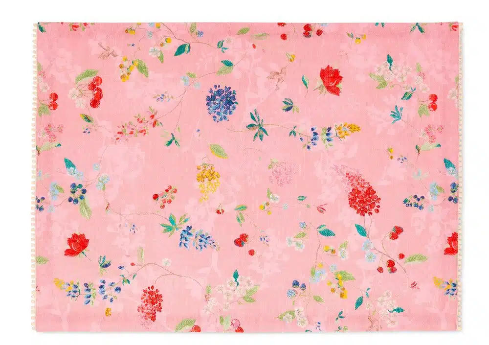 Deze roze theedoek komt uit de serie Hummingbirds en is rijkelijk gedecoreerd met bloemen.